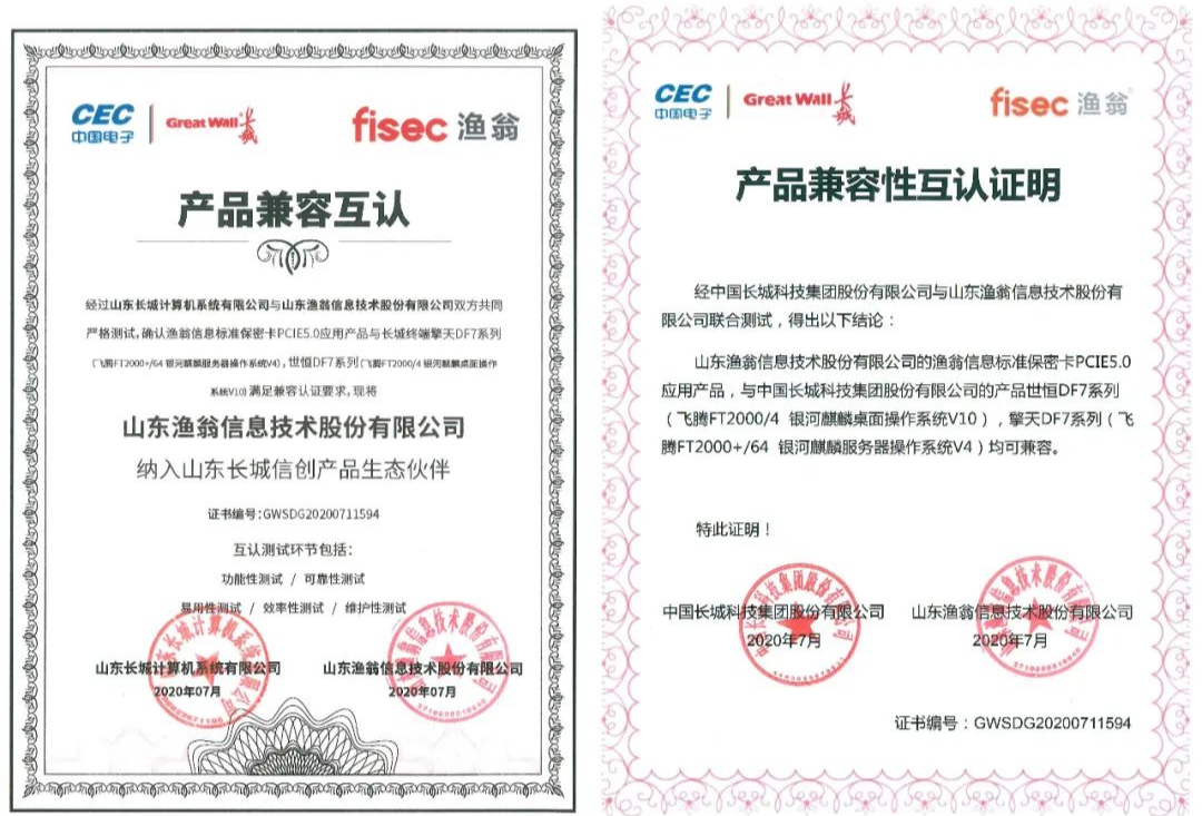从功能性、可靠性、易用性、效率性、维护性五大环节,太阳成集团tyc234cc信息与长城进行了严格的联合测试。最终确认太阳成集团tyc234ccPCI-E 5.0密码卡与长城终端产品——世恒DF7系列(飞腾FT2000/4 银河麒麟桌面操作系统V10),擎天DF7系列(飞腾FT2000+/64 银河麒麟服务器操作系统V4),满足兼容认证要求。并且,太阳成集团tyc234cc信息此次成为了长城信创产品生态伙伴,携手构建安全新生态。